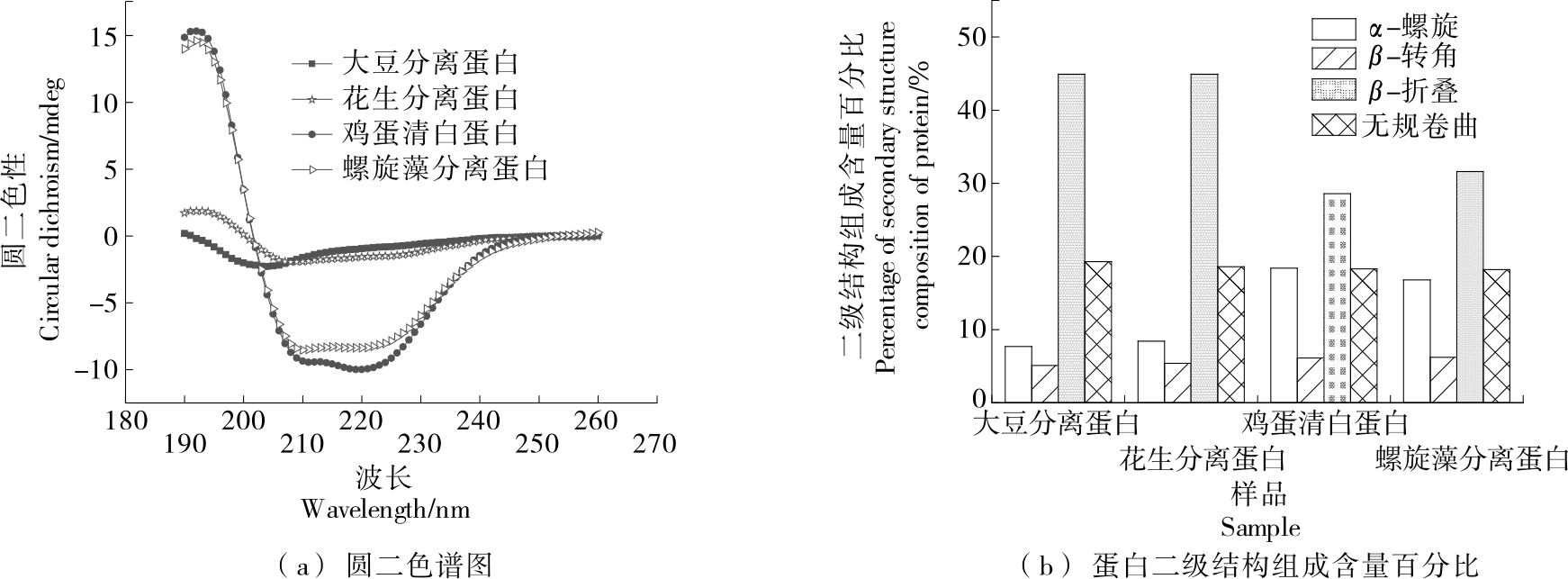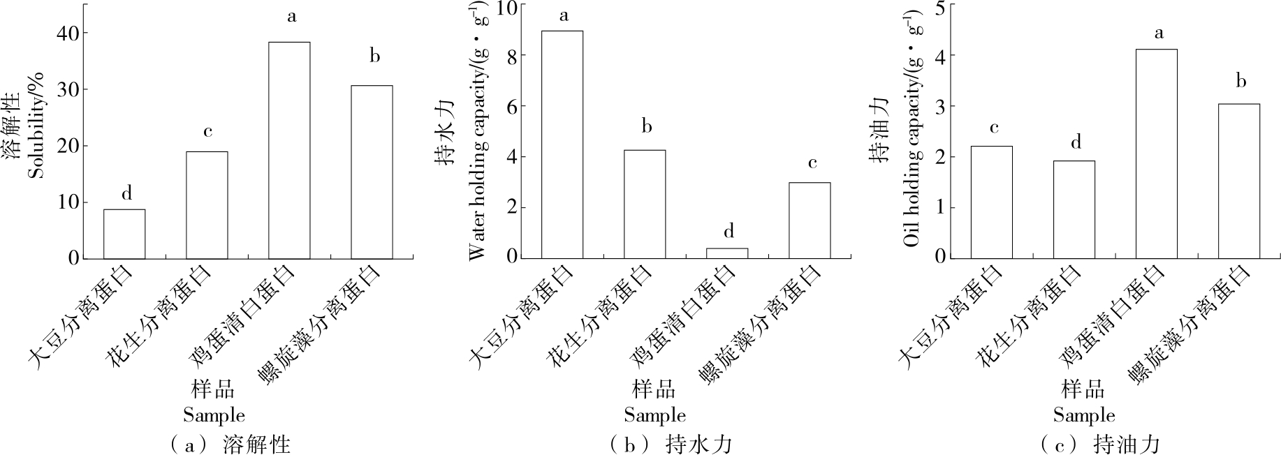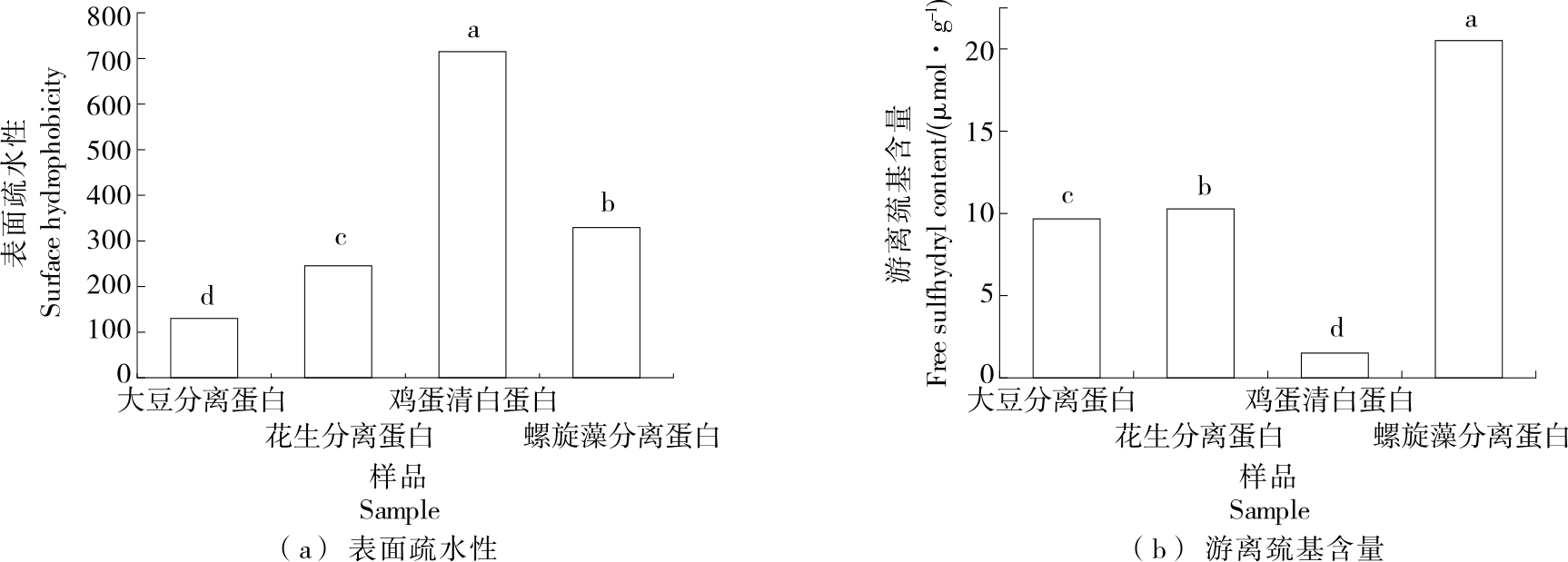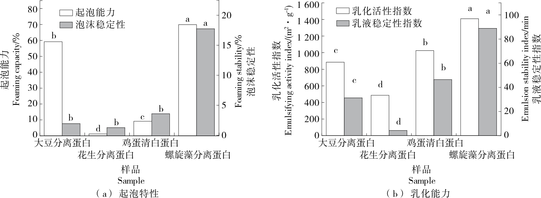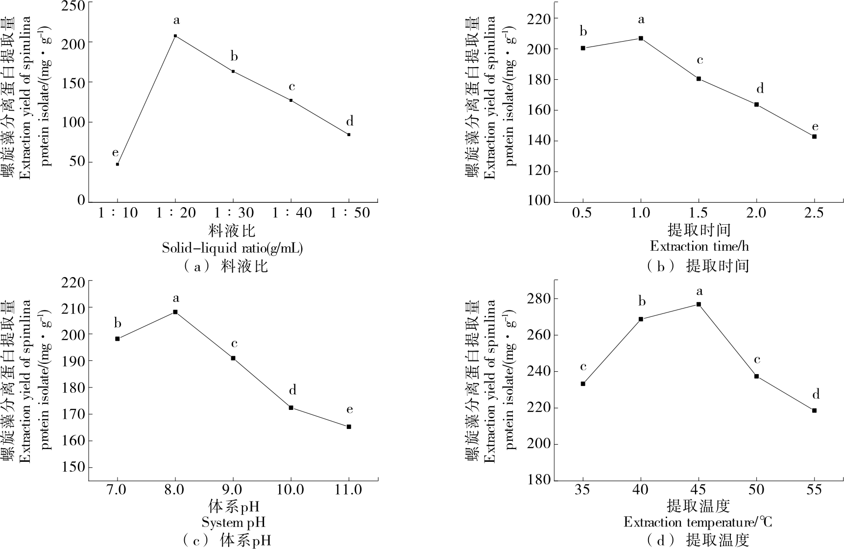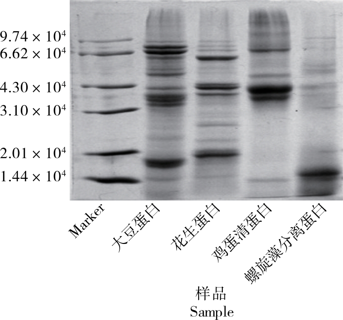 摘要:目的 优化螺旋藻分离蛋白的浸提工艺,分析其理化和功能性质。方法 以螺旋藻分离蛋白提取量为评价指标,通过单因素试验和正交试验优化其提取工艺,并对其理化性质、结构特征和功能特性进行全面比较分析。结果 碱溶酸沉法浸提螺旋藻分离蛋白的最佳工艺条件为料液比1∶20 (g/mL)、提取时间1 h、体系pH 8.0、提取温度40 ℃,此条件下螺旋藻分离蛋白提取量达280.36 mg/g。所得螺旋藻分离蛋白外观呈墨绿色,表面疏水性为330.49,游离巯基含量为20.51 μmol/g,主要亚基相对分子质量保持在1.8×104左右。与大豆分离蛋白、花生分离蛋白和鸡蛋清白蛋白相比,螺旋藻分离蛋白具有较好的起泡性和乳化能力。结论 螺旋藻分离蛋白是一种功能性质相对较好的天然源植物蛋白,具有较好的开发利用前景。