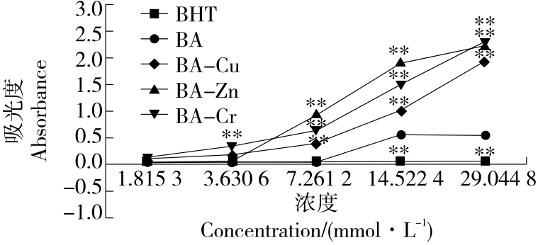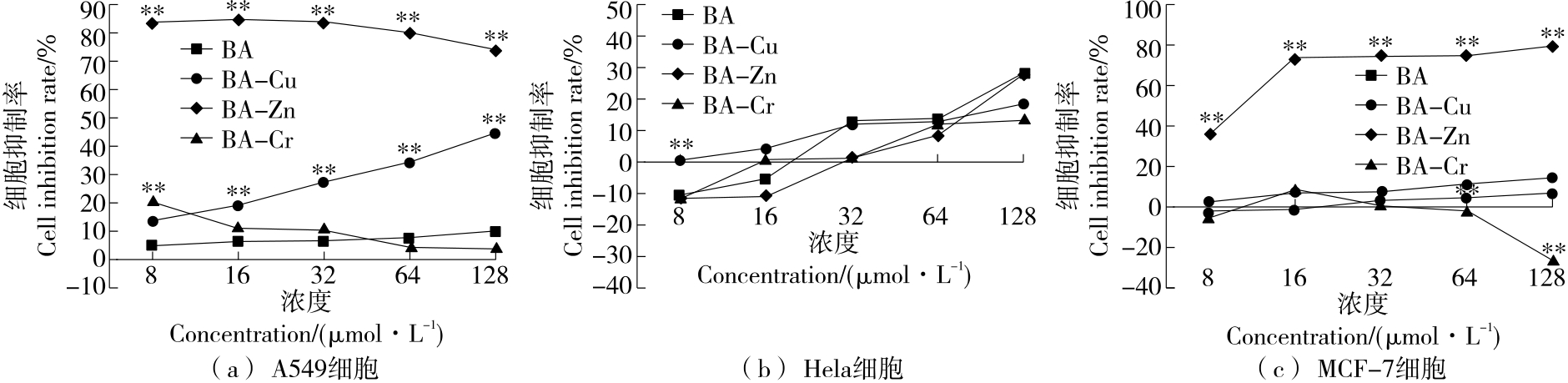 摘要:目的 制备鹰嘴豆芽素A(BA)的金属配合物并探究其生物活性。方法 以鹰嘴豆芽素A为配体,设计合成鹰嘴豆芽素A-铜(BA-Cu)、鹰嘴豆芽素A-锌(BA-Zn)、鹰嘴豆芽素A-铬(BA-Cr)金属配合物,利用紫外光谱、红外光谱等方法对配合物结构进行表征,采用磷钼络合法考察3种鹰嘴豆芽素A金属配合物的抗氧化活性,采用CCK8法考察3种鹰嘴豆芽素A金属配合物的抗癌活性。结果 试验成功制备得到BA-Cu、BA-Zn、BA-Cr 3种鹰嘴豆芽素A金属配合物,3种金属配合物均具有良好的抗氧化活性,且抗氧化活性均高于其配体鹰嘴豆芽素A以及阳性药BHT,其中BA-Cr的抗氧化活性最好。3种鹰嘴豆芽素A金属配合物对人肺癌A549细胞、宫颈癌Hela细胞以及乳腺癌MCF-7细胞的增殖均有一定的抑制效果,且整体高于其配体鹰嘴豆芽素A,其中BA-Zn的抗癌活性最佳。结论 成功制备得到BA-Cu、BA-Zn、BA-Cr 3种鹰嘴豆芽素A金属配合物,其中,BA-Cr的抗氧化活性最好,BA-Zn的抗癌活性最好。