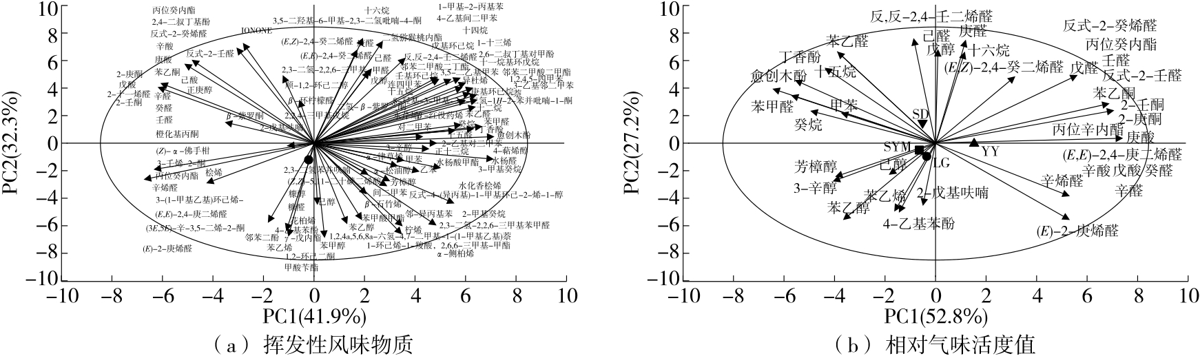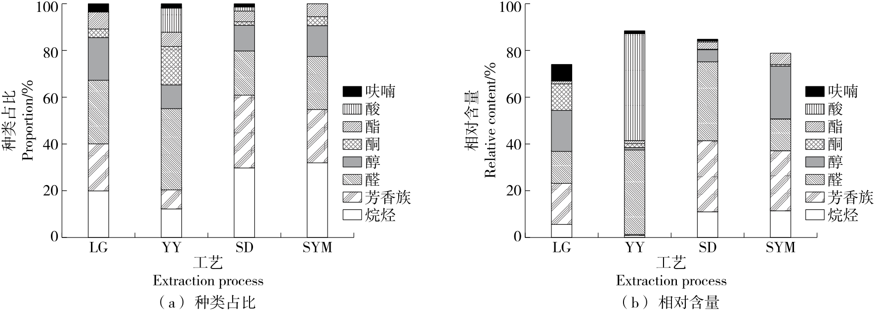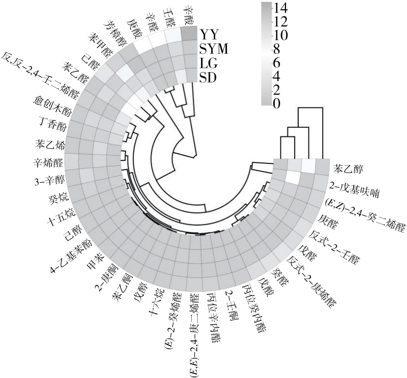 摘要:目的 探究制油工艺对山桐子油挥发性风味物质的影响。方法 采用顶空—固相微萃取—气相色谱—质谱(HS-SPME-GC-MS)法分析螺杆压榨法、液压压榨法、水代法和石油醚浸提法制取的山桐子油挥发性风味物质组成,以相对气味活度值(ROAV)确定主体挥发性香气成分。结果 共检出8类114种挥发性风味成分,其中共有成分12种,相对含量之和为9.92%~24.21%,特有成分相对含量为7.50%~47.99%;结合ROAV值共筛选出18种关键香气化合物、13种风味修饰化合物和6种潜在气味成分。液压压榨和水代法提取油中对总体风味贡献最大的关键香气化合物为(E,E)-2,4-壬二烯醛,呈坚果、油炸味,而螺杆压榨和石油醚浸提油中的为3-辛醇,呈蘑菇、稻草味。结论 液压压榨山桐子油的特有风味物质种类多且含量高、关键香气化合物种类丰富、香味阈值风味物质含量最大,其挥发性风味特点突出且识别度高,类似于坚果、蒲公英、水果的特征香气更浓郁。