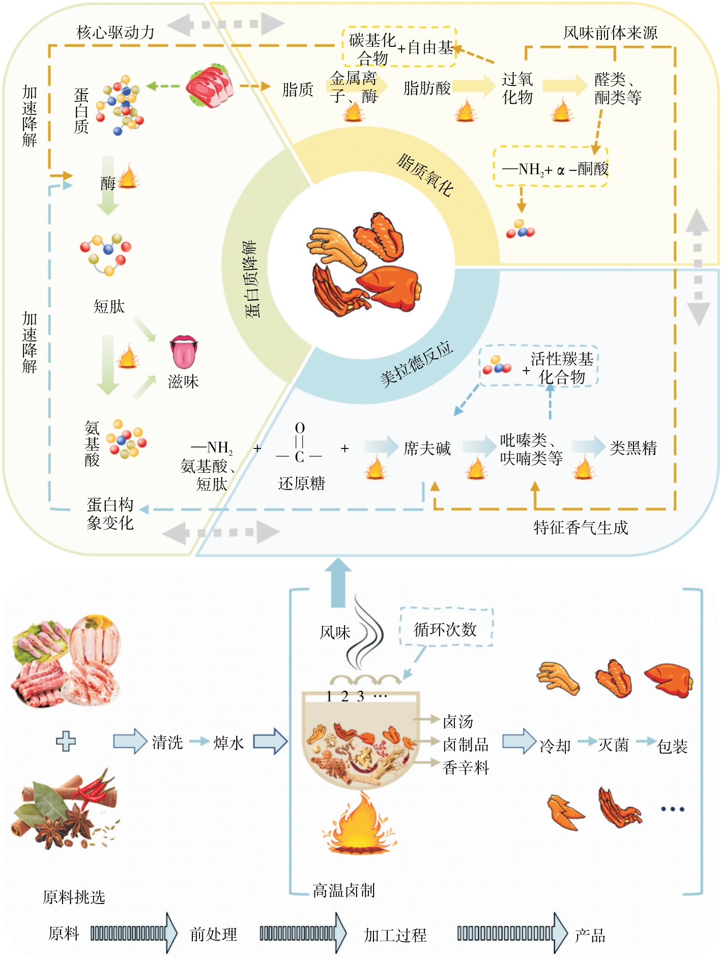 摘要:酱卤肉制品的独特风味来源于内源性前体物质的热诱导转化,以及外源性香辛料的风味协同作用。其风味形成机制涵盖蛋白质和脂质的氧化与降解过程,以及相关次级产物驱动的美拉德反应等多重路径。该综述系统探讨了酱卤肉制品风味化合物的组成特性与调控机制,重点分析了挥发性和非挥发性物质如何共同构建风味基础,风味成分的主要来源,以及加工参数(如温度、时间、卤汤循环次数)如何通过调控反应速率影响风味的强度与稳定性,并归纳总结了酱卤肉制品风味形成的潜在机理,以期为酱卤肉制品风味优化与标准化生产提供理论参考。