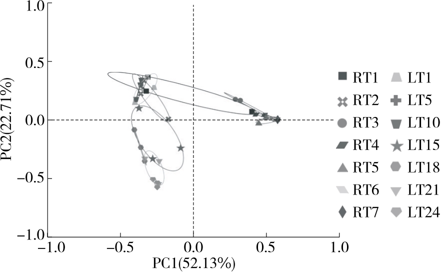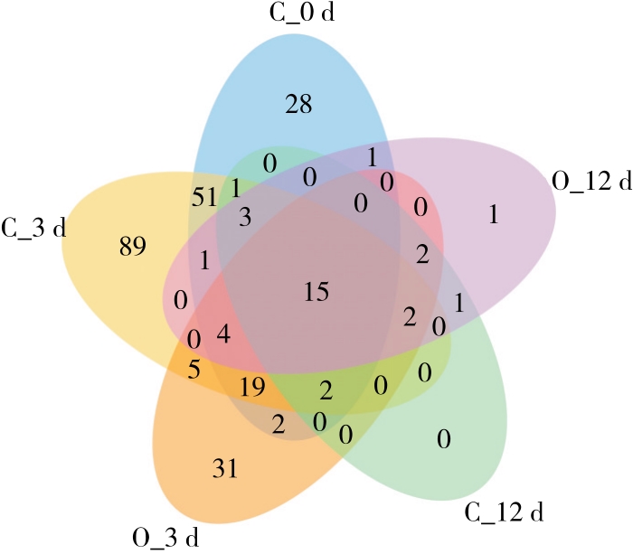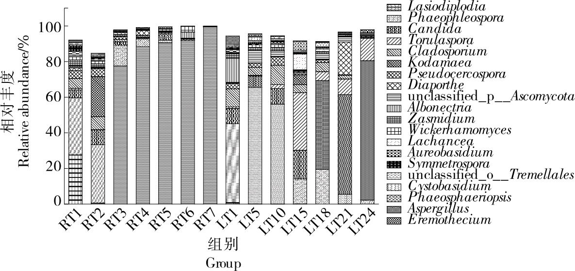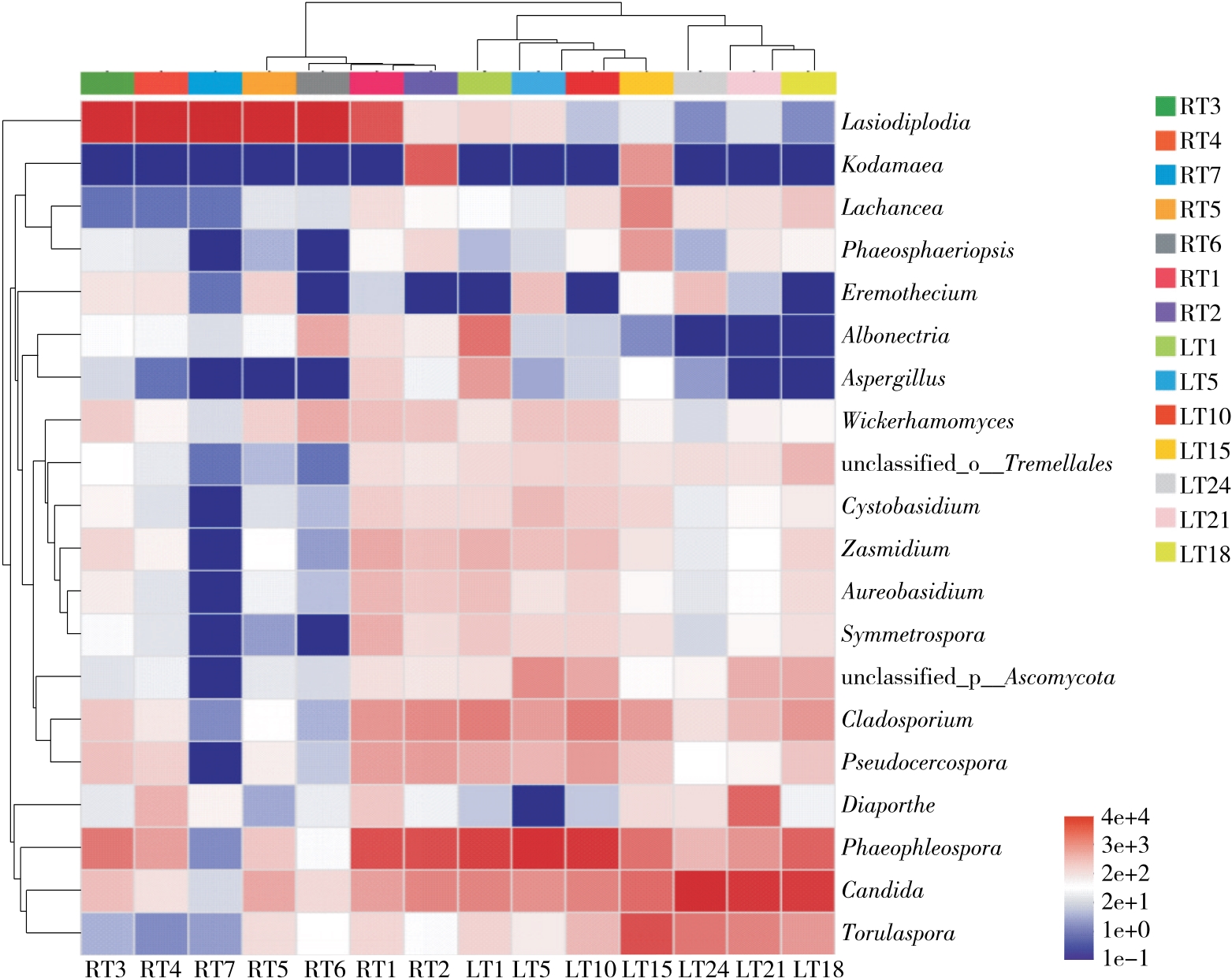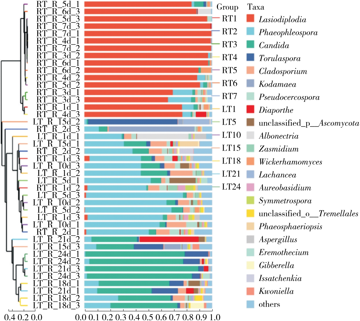 摘要:目的 探究采后龙眼不同货架期真菌群落结构差异及真菌毒素污染情况。方法 采用Illumina MiSeq高通量测序技术对采后龙眼室温(25 ℃)及冷藏贮藏(4 ℃)下真菌多样性进行分析。同时利用超高效液相色谱—串联质谱法对龙眼样本进行44种真菌毒素的含量分析,识别毒素风险危害。结果 随着货架期的延长,采后龙眼果实在室温贮藏过程中真菌多样性和丰富度呈先上升后下降的趋势,而冷藏贮藏过程中则呈先升高后降低再升高的变化趋势。在属水平上,室温贮藏中(1~2 d)、后期(6~7 d)优势菌属为毛色二孢属(Lasiodiplodia),相对丰度为77.55%~99.46%。冷藏贮藏中(10~18 d)、后期(21~24 d)优势菌属为假丝酵母属(Candida)和有孢圆酵母属(Torulaspora),相对丰度分别为78.22%和12.62%。毒素测定分析结果显示,在室温及冷藏贮藏过程中均未检测到真菌毒素。结论 采后龙眼样品在室温及冷藏贮藏条件下,果肉部分受真菌毒素的污染风险较低;龙眼果实货架期腐烂变质主要由毛色二孢属侵染引起,冷藏贮藏条件下龙眼货架期的延长,主要原因是毛色二孢属的生长受到抑制。