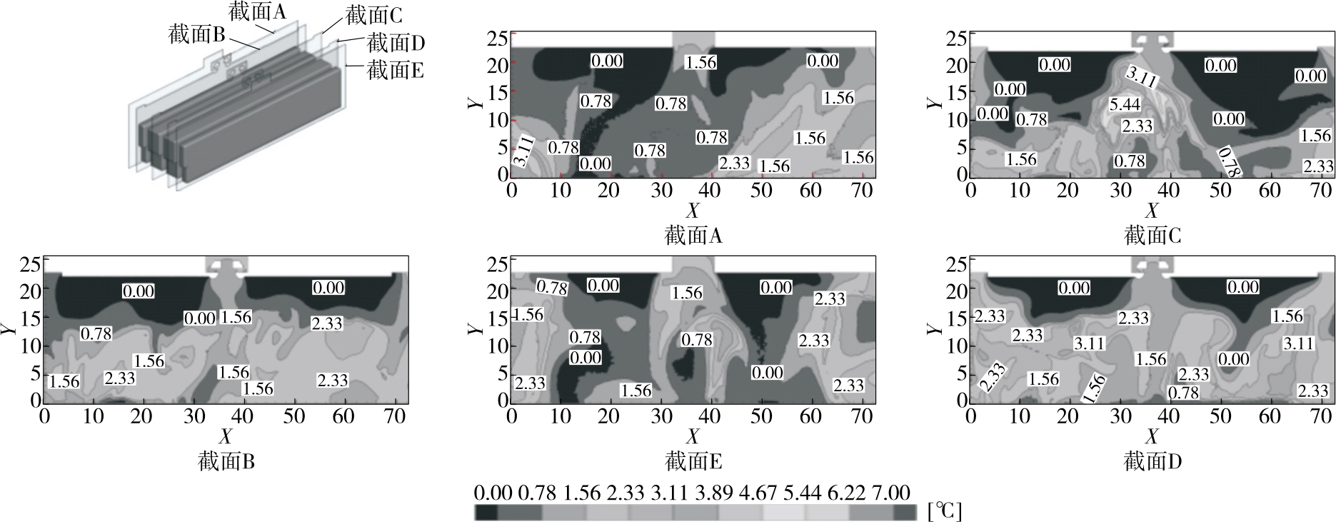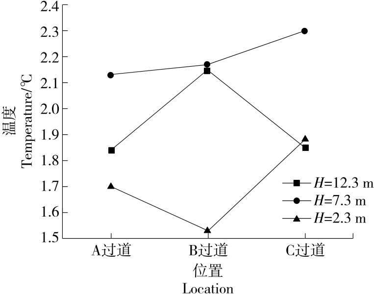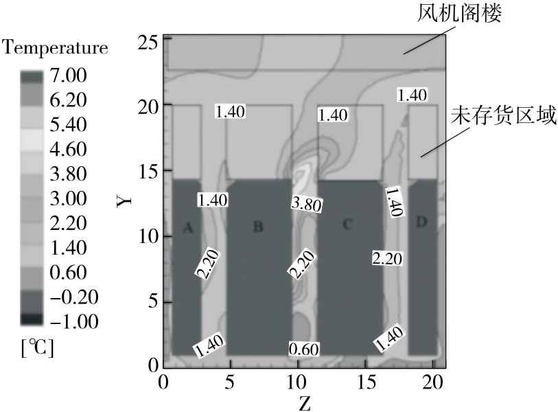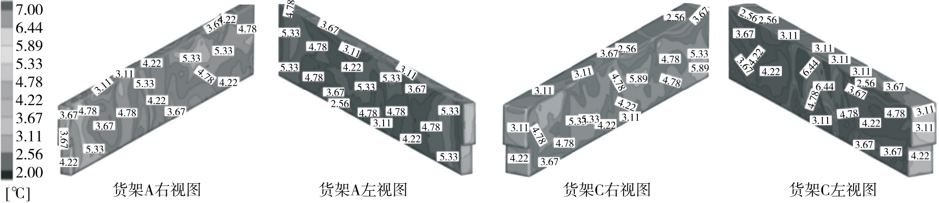 摘要:目的 探究大型果蔬高架库内部气流组织及温度分布情况并剖析其形成机理。方法 以某一大型果蔬高架库为研究对象,采用试验测量和CFD数值模拟技术分析冷库内部实际气流组织情况。结果 堆货区域水平面平均温度随堆货高度的降低而下降,上层高度12.3 m处最高均温为3.05 ℃,中层高度7.3 m处为2.86 ℃,下层高度2.3 m处为2.31 ℃,中上层与中下层温差分别为0.19,0.55 ℃;该冷库采用屋顶式冷风机+织物风道形式,库内气流组织较均匀,但受货箱阻力作用和织物风道送风卷吸影响,堆货越靠近冷库中间,表面温差越大,且在中间过道的中上部(冷风机回风区域)形成高温区。结论 该织物风道设计在冷库中实现了较为均匀的气流组织情况,但受货箱密集和呼吸热堆积影响,部分区域冷却效果不佳,且升温非线性需通过优化保温层来节能和提高设备寿命。
