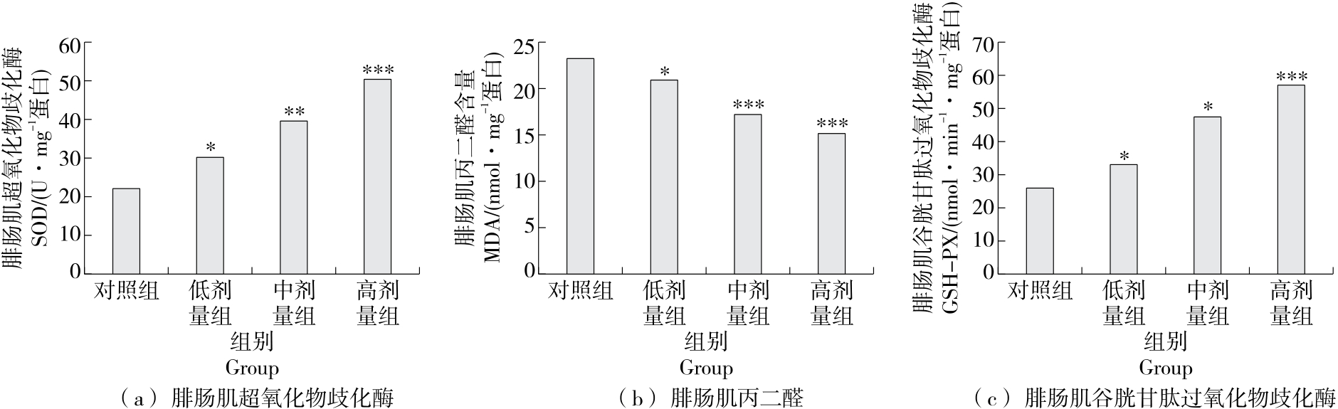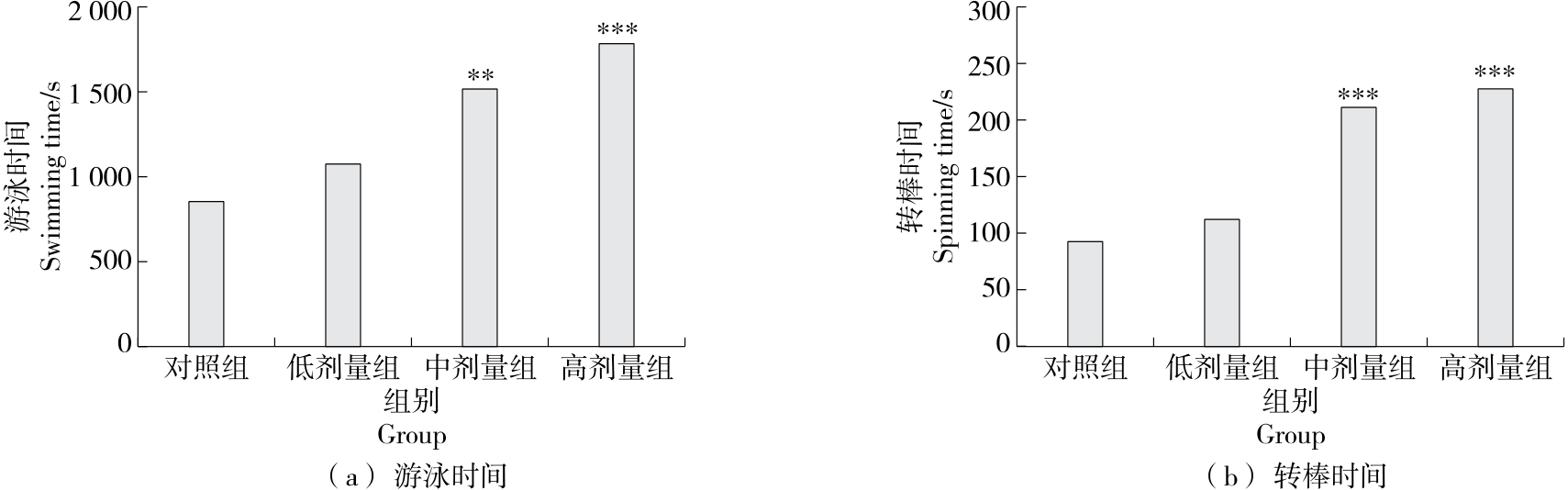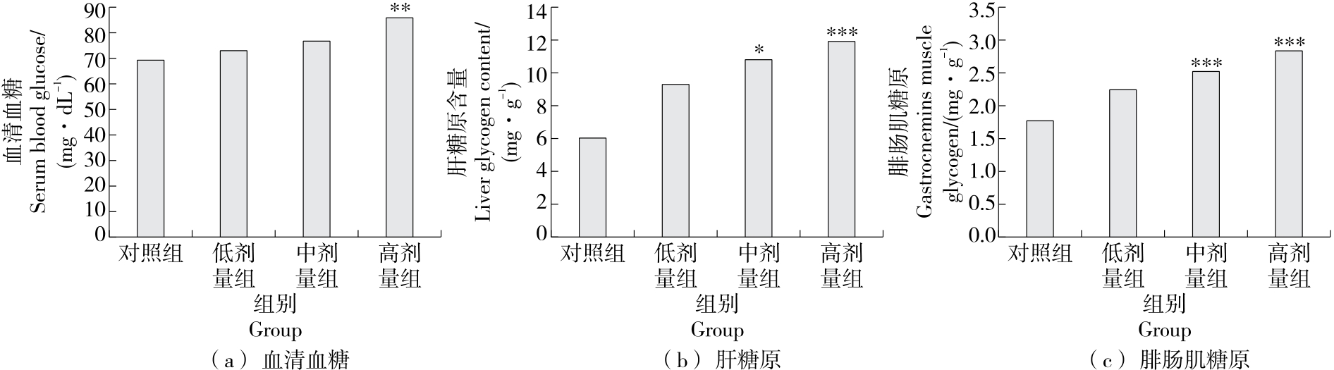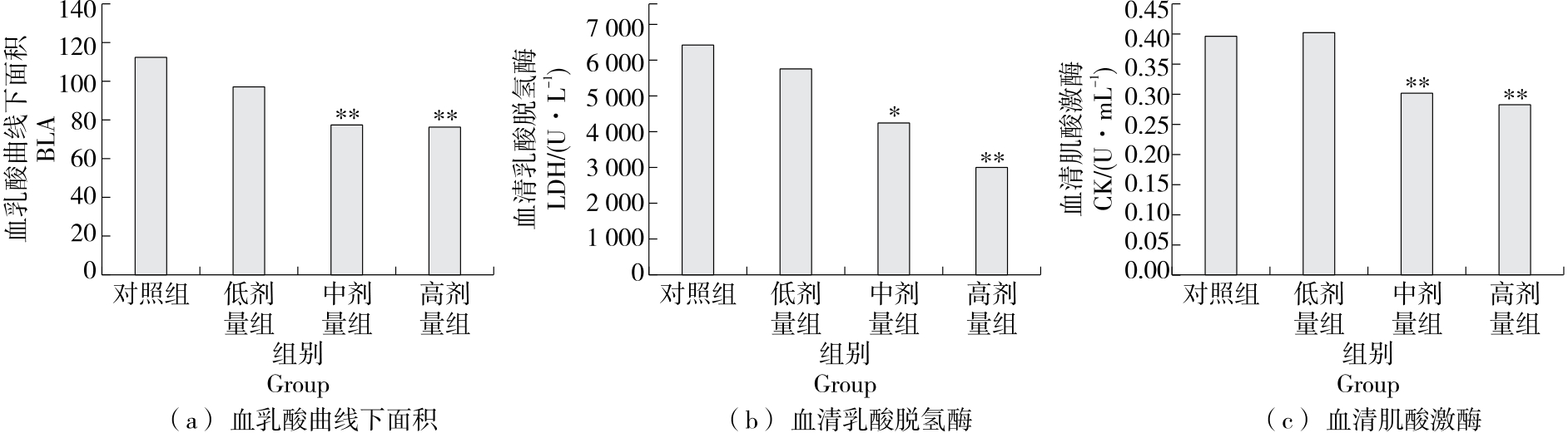 摘要:目的 考察裸藻提取物对小鼠抗疲劳作用及抗氧自由基水平的影响,并分析其具体作用机制。方法 选取40只健康成年雄性昆明小鼠,随机分为对照组(构建小鼠疲劳模型,并用生理盐水代替受试药物注射)、给药低剂量组(裸藻0.25 g/kg BW)、给药中剂量组(裸藻0.50 g/kg BW)和给药高剂量组(裸藻1.50 g/kg BW),灌胃给药,观察受试小鼠的游泳力竭时间和疲劳转棒试验时间,检测小鼠血糖、肝糖原、肌糖原、血尿素氮水平、全血乳酸含量、血清LDH和CK活性,并比较肝脏、腓肠肌与血清中超氧化物歧化酶和谷胱甘肽过氧化物歧化酶及丙二醛含量,综合评价裸藻的抗疲劳、抗氧自由基能力。结果 与对照组相比,裸藻提取物中剂量组和高剂量组的转棒时间显著延长(P<0.05)、小鼠负重游泳时间显著增加(P<0.05);小鼠肌组织中MG及肝脏中LG含量显著增加(P<0.05);小鼠血清中BUN含量显著降低(P<0.05);小鼠游泳后BLA浓度、血清LDH和CK活力显著降低(P<0.05);小鼠血清、肝脏和肌组织中SOD活力显著提高(P<0.05);小鼠血清、肝脏和肌组织中MDA含量显著降低(P<0.05);小鼠血清、肝脏和肌组织中GSH-Px活力显著提高(P<0.05)。结论 裸藻提取物具备有效清除运动过程中产生的超氧阴离子自由基和过氧化氢自由基的能力,可以缓解肌肉疲劳并减少运动性疲劳的发生。