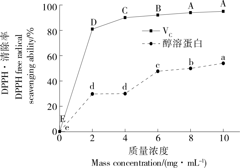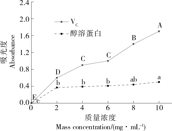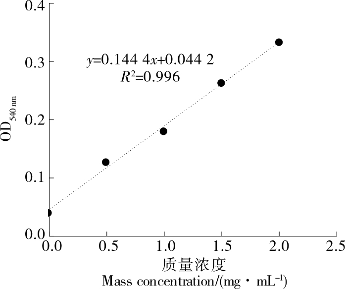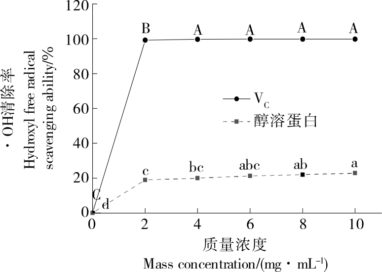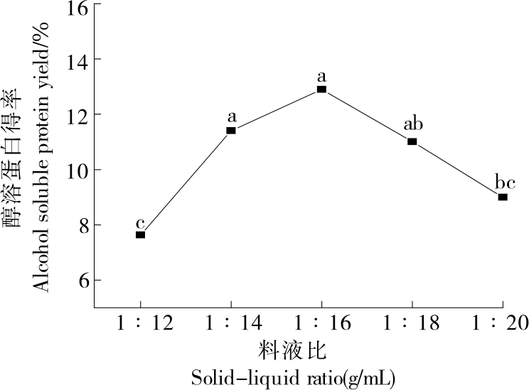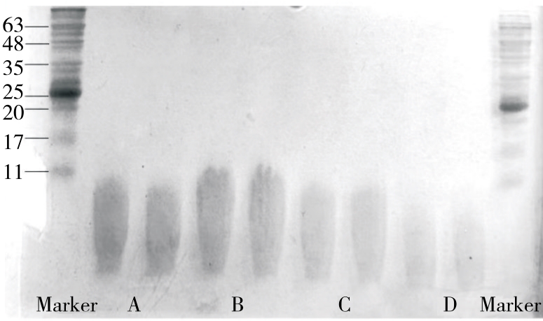 摘要:目的 优化青稞酒糟醇溶蛋白提取工艺,提高青稞酒加工副产物的附加值。方法 以青稞酒糟为原料,采用超声辅助乙醇法提取青稞酒糟醇溶蛋白,并以青稞酒糟醇溶蛋白得率为指标,分析不同料液比、超声温度、超声功率、超声时间4个因素对青稞酒糟醇溶蛋白得率的影响,通过正交试验优化提取工艺,从而确定最佳提取条件。采用SDS-PAGE分析蛋白相对分子质量分布,鉴定其为醇溶蛋白。以VC为对照,对青稞酒糟醇溶蛋白抗氧化活性(DPPH·、·OH的清除率和总还原能力)进行对比分析。结果 青稞酒糟醇溶蛋白的最佳提取工艺条件为料液比1∶16 (g/mL)、超声温度35 ℃、超声功率320 W、提取时间60 min,在此条件下,青稞酒糟醇溶蛋白得率为(18.50±0.020)%。SDS-PAGE电泳分析结果显示提取的蛋白相对分子质量主要分布在11~17和<11,进一步确定该蛋白为醇溶蛋白,其相对分子质量较小。体外抗氧化试验结果表明,青稞酒糟醇溶蛋白DPPH·、·OH的清除率及总还原能力均随抗氧化剂质量浓度的增加而增大,并在相同质量浓度下均弱于VC,当青稞酒糟醇溶蛋白质量浓度为10 mg/mL时,DPPH·、·OH的清除率分别为(54.00±0.020)%和(22.90±0.010)%,对Fe3+的还原能力在此质量浓度下达到最大值0.50±0.100。结论 优化工艺提取的青稞酒糟醇溶蛋白具有较好的体外抗氧化活性,有被开发为抗氧化剂的潜力。