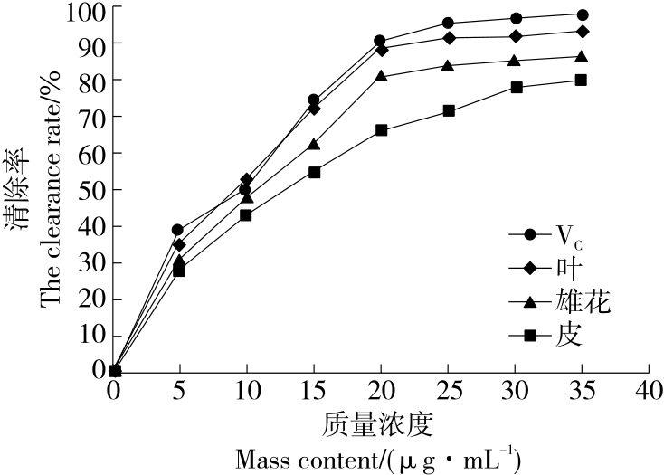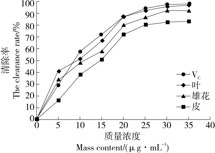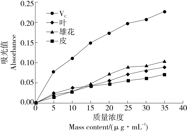 摘要:目的 研究杜仲不同部位的营养成分和体外抗氧化能力。方法 参照国标方法测定不同部位的蛋白质、脂肪、灰分、维生素C、多糖、黄酮以及绿原酸的含量;采用ABTS+自由基清除法、DPPH自由基清除法和总还原力法评估不同部位杜仲的抗氧化活性。结果 杜仲不同部位之间的基本营养素含量均存在统计学差异(P<0.05),叶中的灰分和脂肪含量最高,分别为13.65,6.19 g/100 g;雄花中的蛋白质和维生素C含量最高,分别为20.8,13.9 g/100 g;杜仲叶中的总黄酮、绿原酸以及多糖含量最高,分别为2.45,1.61,1.27 g/100 g。体外抗氧化活性结果表明,杜仲雄花的总还原能力最大,其IC50值为10.2 μg/mL;杜仲叶的ABTS+自由基清除能力和DPPH自由基清除能力最大,其IC50值分别为11.19,11.40 μg/mL。隶属函数法综合评价结果表明,杜仲叶的抗氧化效果最好,杜仲皮的抗氧化效果最弱。结论 杜仲树皮、叶及雄花的营养价值及抗氧化性存在差异,杜仲叶作为药食同源物质在未来食品原料的开发利用方面具有一定的营养学价值。