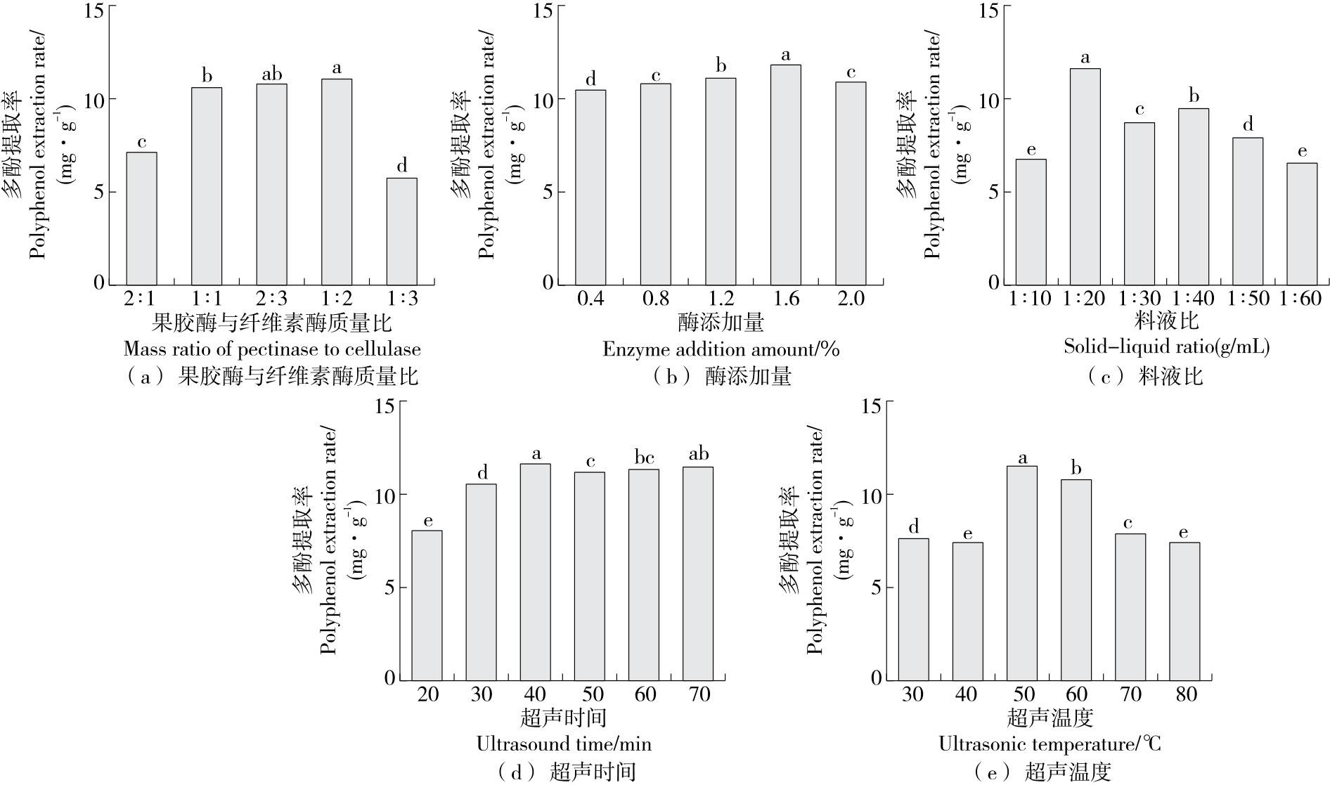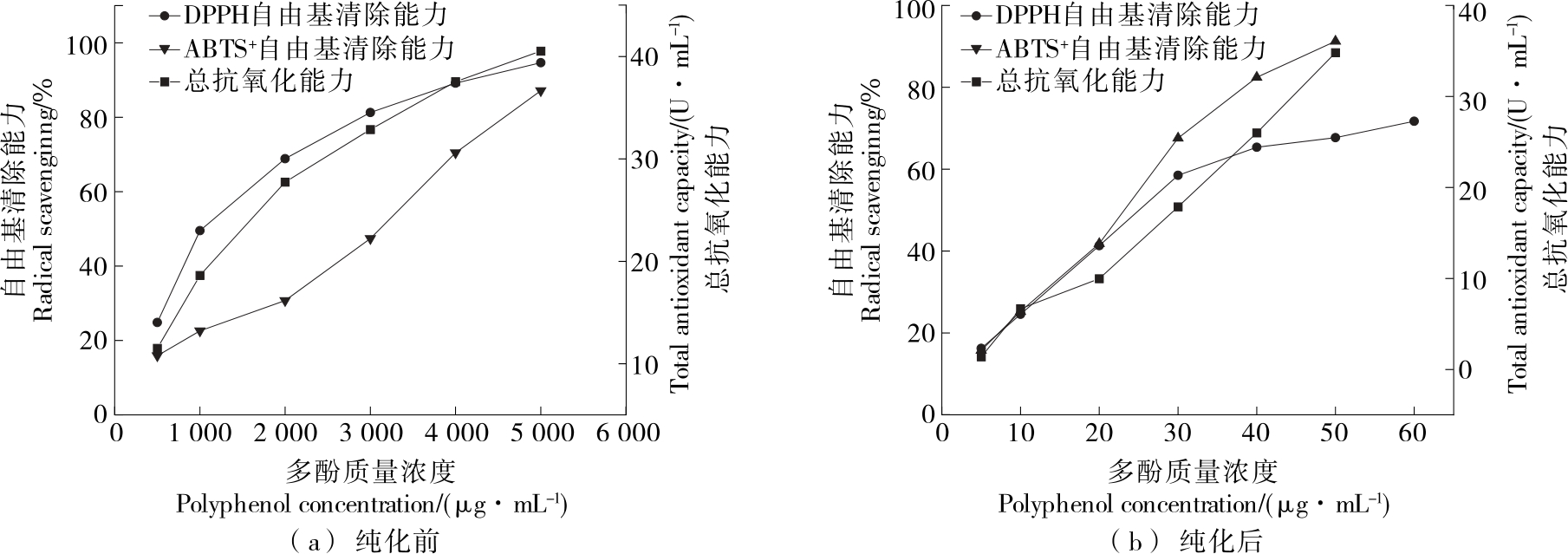 摘要:目的 以新疆酸李果实为原料,探究多酚类物质制备工艺优化及其抗氧化活性。方法 通过单因素和响应面Box-Behnken试验优化超声辅助复合酶法提取新疆酸李多酚类物质的最佳制备工艺条件。采用大孔树脂对新疆酸李多酚进行富集纯化,并考察纯化前后新疆酸李多酚的DPPH自由基、ABTS+自由基清除能力以及总抗氧化能力。结果 超声辅助复合酶法最佳提取工艺为果胶酶与纤维素酶质量比1∶2,酶添加量1.5%、料液比1∶29 (g/mL)、超声时间37 min、超声温度60 ℃,得到最佳多酚提取率(12.82±0.43) mg/g。经过静态吸附—解吸筛选出HPD-300为最优纯化树脂,其吸附达到平衡需要2 h、解吸达到平衡需要0.5 h;HPD-300大孔吸附树脂纯化新疆酸李多酚的最佳工艺条件为上样质量浓度100 mg/mL、上样液体积180 mL、吸附速率120 mL/h、洗脱剂(乙醇)体积分数60%,洗脱剂用量210 mL;经HPD-300大孔吸附树脂纯化后新疆酸李多酚对DPPH自由基和ABTS+自由基的IC50值是纯化前的43.16倍和16.00倍,总抗氧化能力也显著提高。结论 超声辅助复合酶法结合HPD-300大孔吸附树脂纯化可以有效地实现新疆酸李多酚的高效富集和提纯,并能显著提高新疆酸李多酚的抗氧化活性。