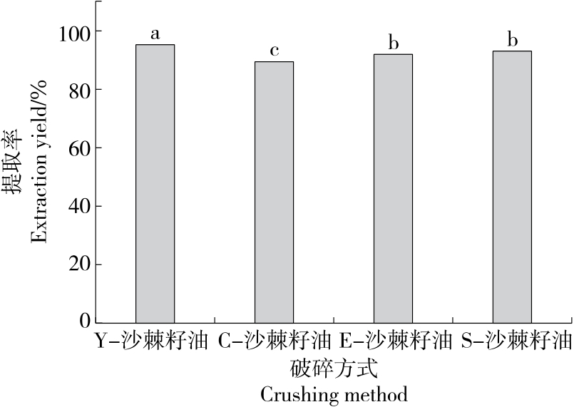 摘要:目的 探究亚临界丁烷萃取沙棘籽油的提取效果及品质。方法 以提取率为评价指标,采用响应面法优化亚临界丁烷萃取沙棘籽油(Y-沙棘籽油)工艺条件,并对比分析超临界CO2萃取沙棘籽油(C-沙棘籽油)、超声辅助提取沙棘籽油(E-沙棘籽油)和传统溶剂提取沙棘籽油(S-沙棘籽油)的提取率、理化指标(酸价、过氧化值、碘值、皂化值、不溶性杂质)、脂肪酸组成、脂肪伴随物(维生素E、磷脂、生育酚、角鲨烯和甾醇)、总酚、总黄酮、DPPH自由基清除率、ABTS+自由基清除率和FRAP抗氧化能力等多维品质指标。结果 沙棘籽原料经超微粉碎结合轧坯预处理的提取率为78.97%,显著高于普通粉碎和超微粉碎预处理的。亚临界丁烷萃取沙棘籽油的最佳工艺参数为料液比1∶10 (g/mL),萃取时间64 min,萃取温度52 ℃,此条件下沙棘籽油提取率为95.21%,较C-沙棘籽油、E-沙棘籽油和S-沙棘籽油的分别提高了5.54%,3.21%,1.25%。Y-沙棘籽油的碘值最高、皂化值最低;沙棘籽油中的主要脂肪酸为亚油酸、α-亚麻酸和棕榈酸;Y-沙棘籽油的维生素E含量为182.5 mg/100 g,角鲨烯、总甾醇、总黄酮、总酚含量较高,DPPH自由基清除能力、ABTS+自由基清除能力和FRAP铁离子还原能力较强。结论 亚临界丁烷萃取所得沙棘籽油的理化性质较稳定,且营养活性物质含量较多,抗氧化能力强。
