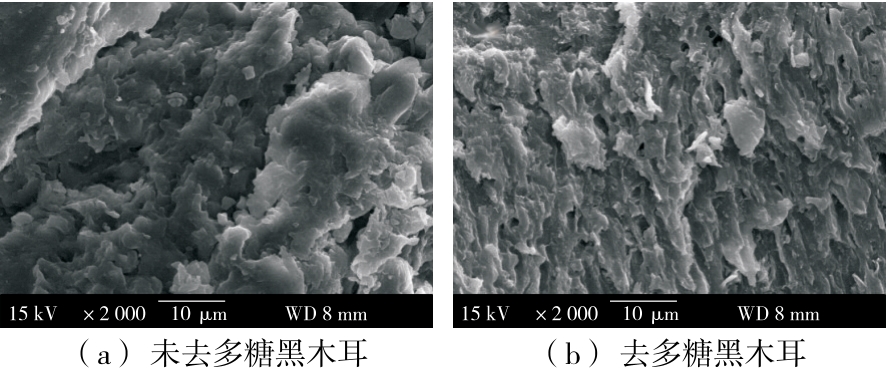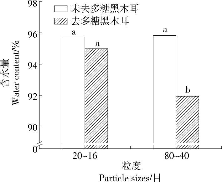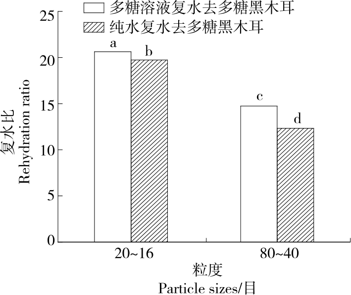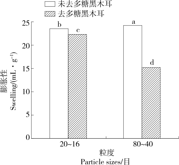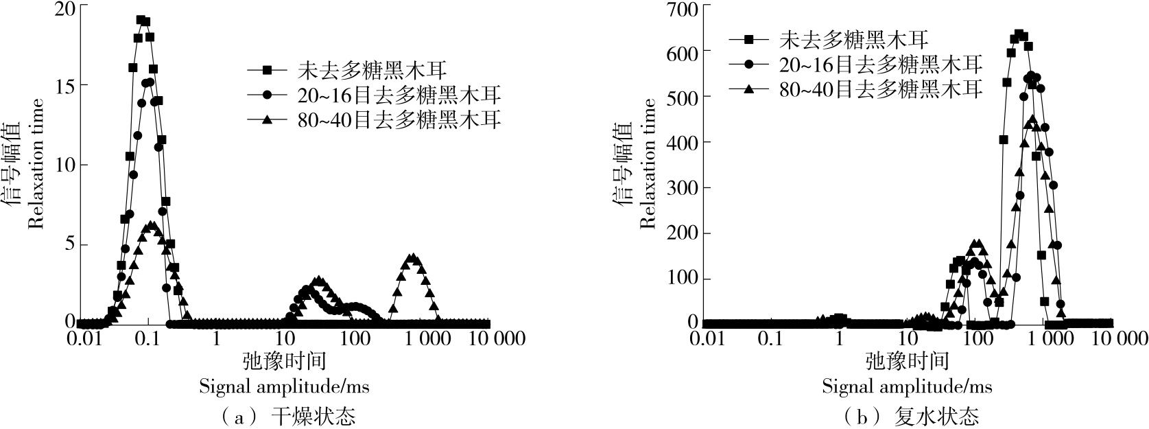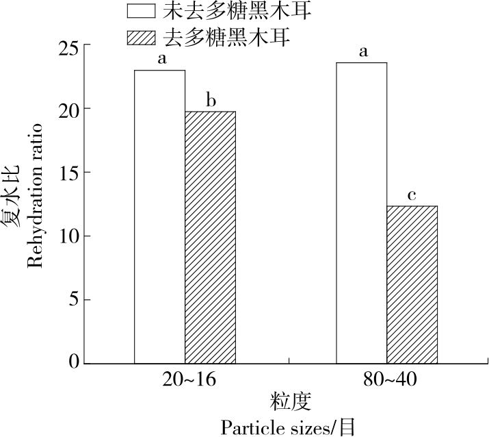 摘要:目的 探究黑木耳多糖对黑木耳复水特性的影响。方法 采用热水浸提—超声辅助法提取黑木耳多糖,将去除多糖的黑木耳烘干至恒重后进行复水,测定其复水后的含水量、膨胀性、复水比以及质构特性、水分分布状态、微观结构,探究黑木耳中多糖含量对其复水性的影响。结果 黑木耳破碎程度与多糖去除率成正比,80~40目去多糖黑木耳的多糖去除率高于未去多糖黑木耳及20~16目去多糖黑木耳的,内部多糖含量较低,其含水量、膨胀性、复水比结果较差,且去多糖处理后的黑木耳与水分结合能力较差,细胞损伤严重。结论 黑木耳多糖具有提高黑木耳复水特性的功能。