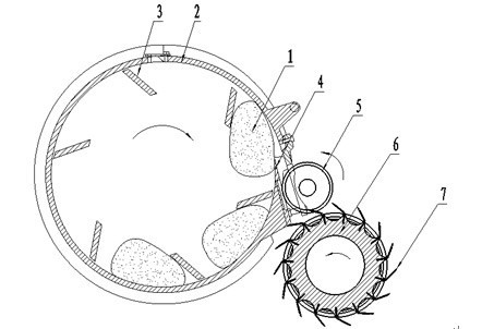 1. 果蔬 2. 滚筒 3. 推进器 4. 切片刀 5. 圆盘刀总成 6. 横切刀总成 7. 横切刀(中文用小五号宋体,字母及数字用小五号Times New Roman,居中)
