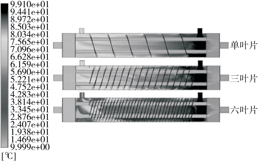 摘要:目的 对气相旋转换热器进行结构优化,改善单叶片壳程结构气相旋转换热器换热效率较低的问题。方法 通过建立简化模型和CFD法,对3种壳程结构换热器性能进行分析。以壳程压降和对流换热系数为试验指标,探究工作圈数、叶片高度、叶片宽度等主要参数对壳程压降和对流换热系数的影响规律,并进行优化与验证。结果 六叶片结构换热器的总体性能较好,壳程压降降低了7%~8%,对流换热系数提高了8%~10%。当工作圈数为3、叶片高度为45.05 mm、叶片宽度为4.79 mm时,六叶片结构换热器的最小壳程压降为6.95 kPa,较优化前降低了15%~21%;最大对流换热系数为183.35 W/(m2·K),较优化前提高了10%~12%。壳程压降模拟值与试验值误差≤6%,对流换热系数模拟值与试验值误差≤5%,优化结果可靠。结论 在优化后的壳程结构下,气相换热器具有良好的换热性能。