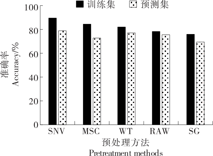 摘要:目的 实现对人参果损伤程度的准确、无损检测。方法 通过自由落体碰撞方式制备不同损伤级别的人参果样本,采集各类样本高光谱数据,分析4种不同预处理方法对随机森林(RF)分类模型的影响。采用连续投影算法(SPA)、竞争性自适应重加权算法(CARS)对预处理后的光谱数据进行特征波长提取,构建偏最小二乘法判别分析(PLS-DA)、支持向量机(SVM)和RF 3种机器学习分类模型并进行对比分析。利用贝叶斯(BO)算法对最优模型的超参数进行寻优。结果 标准正态变换(SNV)预处理后模型分级效果最佳,预测集准确率达到78.89%;特征波长提取后,分级准确率有所提高,SNV-CARS-RF模型表现出了最佳分级性能,预测集准确率为92.78%;最后经BO算法对SNV-CARS-RF模型的4个超参数完成优化,模型准确率提升至100%。结论 使用高光谱技术结合机器学习算法能够实现对不同损伤级别的人参果准确检测。