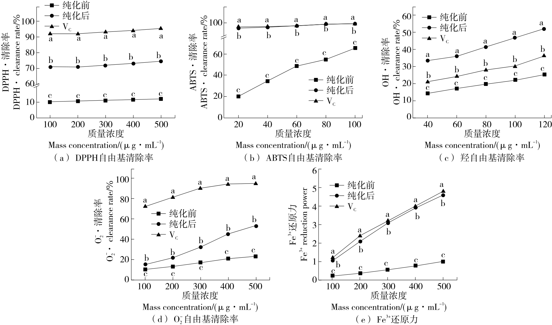 摘要:目的 研究芒果核仁多酚的提取纯化工艺及抗氧化性能。方法 采用正交试验优化芒果核仁粗多酚提取工艺及大孔树脂柱层析法进一步分离纯化芒果核仁多酚提取物,以维生素C为对照考察纯化前后芒果核仁多酚的抗氧化活性。结果 芒果核仁多酚的最佳提取工艺为料液比1∶40 (g/mL),50%乙醇,浸提温度65 ℃,提取时间70 min,该条件下多酚含量为9.93 mg/g; LX-17吸附—解吸效果最好,静态吸附和解吸平衡时间为2.5 h;动态吸附—解吸条件为上样液浓度300 μg/mL,体积40 mL,流速3 mL/min;洗脱剂乙醇体积分数50%,320 mL,流速2 mL/min。此条件下芒果核仁多酚含量从9.93 mg/g提高到35.68 mg/g。纯化后芒果核仁多酚对DPPH自由基、ABTS自由基、羟自由基、O2-自由基和Fe3+还原力均有显著性增加,IC50值分别为19.25,0.02,106.90,464.00 μg/mL。结论 芒果核仁多酚具有良好的抗氧化活性。