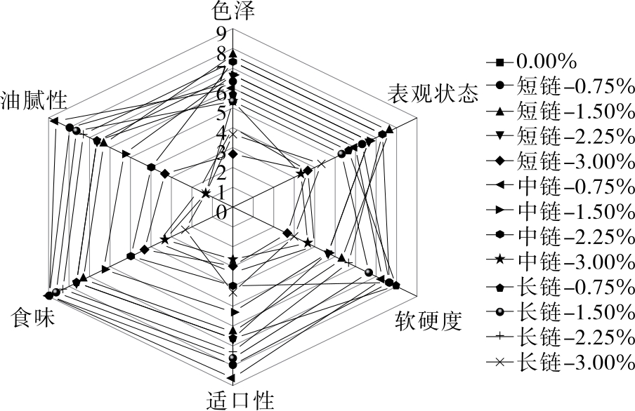 摘要:目的 探究菊粉对非发酵速冻油条品质的影响。方法 以不同聚合度的菊粉为研究对象,测定不同的菊粉添加量0%,0.75%,1.50%,2.25%,3.00%(质量分数)对非发酵速冻油条的水分含量、含油量、比容、色泽、质构特性、感官评价的影响。结果 3种不同聚合度的菊粉在一定的添加量范围内能有效提高非发酵速冻油条的水分含量和比容,降低含油量,过量则会带来负面效果。随着3种聚合度菊糖的加入均可增加非发酵速冻油条的硬度,并随着添加量的增加呈先上升后下降趋势。结论 与空白组相比,适量添加菊粉可提升产品的色泽,增大油条的比容,改善油条的食用品质。