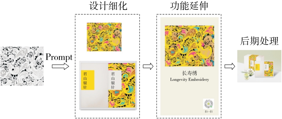 摘要:探究“传统纹样+AI”新模式下湖南茶叶包装的创新设计形式。基于“传统纹样+AI”模式下的Stable Diffusion 模型技术,对马王堆丝织品刺绣纹样进行创新转化,并应用在君山银针茶叶包装设计中。研究结果表明,通过Stable Diffusion模型技术成功实现了马王堆丝织品刺绣纹样的智能生成,将生成后的纹样应用于君山银针茶叶包装设计,形成了风格鲜明、辨识度高的包装方案,且纹样与茶叶产品属性、包装结构适配度良好,有效实现了传统纹样在茶叶包装中的创新性应用。